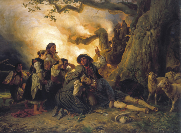 Jacob Becker, 1844, Städelmuseum, Frankfurt Felipe Barandiarán Las gentes de la aldea estaban entregadas a sus labores cuando un rayo se ha precipitado sobre el árbol que cobijaba al pastor. En un instante sus ramas se han transformado en voraz tea encendida. Acuden presurosos en su auxilio. Está tendido en el suelo, inconsciente. El sombrero abandonado a su suerte, los ojos cerrados y su cuerpo inerte. Todos tratan de reanimarle. Dilación no admite el caso y no hay quien dar consejo pueda. El primer hombre que ha llegado, reincorporándolo sobre su regazo, con la mano en alto trasmite algunas instrucciones. Una mujer, arrodillada con cariño ante él, extiende la palma de su mano sobre la frente y le habla con insistencia para ver si despierta. Otra, presa del pánico, desesperada, se lleva las manos a la cabeza. Detrás, otras dos, más jóvenes, asisten con sorpresa y aprensión, sin comprender realmente lo que está pasando. Entre ellas, un niño, inquieto y con la mirada atónita, asoma la cabeza y quiere enterarse de todo. Hasta el perro intenta reanimar a su amo, tocándole una y otra vez con la pata. Las ovejas parecen estar tristes y desconcertadas. Sienten el peligro pero la voz que les guiaba ha enmudecido. Mientras, la bulliciosa y oscura nube anaranjada, que consume los restos del árbol, proyecta su luz trágica sobre la escena y ensombrece los campos. Drama de la vida que nos recuerda algunas verdades esenciales y eternas. El hombre moderno, ante tantos avances, tiene la tendencia a creerse que todo, o casi todo, puede tenerlo previsto y controlado. Intenta alejar cualquier sombra de incertidumbre suscribiendo todo tipo de seguros. Pero, aunque es bueno ser previsor, con frecuencia se olvida de que todo depende de Dios, y ante los “accidentes” se rebela. Nuestros simpáticos aldeanos del cuadro saben que esta vida es un valle de lágrimas, como reza la Salve. Y que ellos, como sus cosechas, dependen de Dios. Por eso miran al cielo y en Él ponen su confianza.