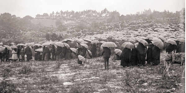 “Las épocas de grandes calamidades han revivido y renovado siempre las ideas religiosas y las han favorecido. Y la guerra, que azota en todas partes, les ofrece el terreno más favorable y fértil para su desarrollo. Vemos esto confirmado en la vida de las trincheras y aun en la atmósfera espiritual de los países beligerantes”. Después de algunas observaciones relativas a los especuladores que indudablemente esperaban sacar ventaja de la credulidad de las masas, daba un relato imparcial de los acontecimientos de Fátima y recordaba apariciones anteriores de la Virgen en Lourdes, La Salette y otros lugares. Después continuaba con más ironía: “El milagro tiene lugar entre mediodía y la una de la tarde, según aquellos que han estado allí. Pero no todos tienen la suerte de ver la santa figura. El número de los escogidos parece ser muy pequeño. A pesar de sus esfuerzos, muchos no ven nada, Esta es la razón de que aquellos que se encuentran cerca de los niños se contenten con oírles hablar con una compañera invisible. Otros, por el contrario, distinguen en momentos solemnes y divinos las estrellas brillando en el firmamento, aun estando el sol en el zenit. Estos oyen un ruido subterráneo que anuncia la presencia de la Señora. Pretenden que la temperatura desciende y comparan las impresiones de aquel momento con las que han experimentado durante un eclipse de sol… “Conforme a lo que dicen los niños, la figura de la Virgen aparece sobre una carrasca rodeada por todas partes de una nube… La sugestión de las masas, producida allí por lo sobrenatural y alentada por una fuerza sobrehumana, es tan potente que los ojos se llenan de lágrimas, las caras toman palidez cadavérica, hombres y mujeres caen de rodillas, cantan plegarias y recitan juntos el rosario. “No sabemos si ha habido ya personas ciegas que han recuperado la vista, paralíticos que han recobrado el uso de sus miembros, pecadores empedernidos que han abandonado el camino del pecado para sumergirse en el agua purificadora de la penitencia. “Pero eso no importa. La noticia de las apariciones se ha propagado desde el Algarve hasta el Miño. Desde el día de la Ascensión los peregrinos han acudido por miles hasta allí, en el día 13 de cada mes, de las cercanías y de las lejanías. No bastan los medios de transporte. “El clero del lugar y de la vecindad mantiene con respecto a los hechos una prudente reserva, por lo menos en apariencia. Es la costumbre de la Iglesia. Proclama en alta voz que en tales circunstancias la duda no significa nada, pues las dudas también proceden del diablo. Pero secretamente se regocija por la gran concurrencia de peregrinos, que desde mayo se han hecho cada vez más numerosos. “Y hasta hay gente que sueña con una iglesia grande y magnífica, siempre llena, con grandes hoteles en las proximidades que posean todo el confort moderno, con tiendas bien provistas de miles de objetos piadosos y recuerdos de Nuestra Señora de Fátima, y con un ferrocarril que nos llevará al futuro santuario milagroso más cómodamente que los autobuses en los que, por el momento, la masa de los fieles y curiosos realiza el viaje…”. Mientras el autor de estas observaciones pesimistas se dirigía a Ourém, y más tarde, con incomodidad mayor, a Cova da Iría, las familias dos Santos y Marto, después de una noche en vela escuchando el golpear de las gotas de lluvia sobre el tejado, se levantaban en el triste amanecer. Apenas se teñía el Este de una tonalidad gris apagada y ya los primeros peregrinos, calados, llegaban, golpeando sus puertas. Un vecino le cogió por la manga y le dijo al oído: —Tío Marto, harías mejor no yendo a Cova da Iría. Podrían pegarte. A los pequeños, no. Son niños, y nadie les hará daño. Tú corres el peligro de ser arrastrado. —Voy, desde luego —respondió el otro— y no tengo miedo a nadie. No dudo que todo marchará bien. —Si nos matan —dijo Jacinta— nos vamos al cielo. Pero aquellos que nos ataquen, pobres infelices, se van al infierno. En el último momento María Rosa se puso su chal y dijo que les acompañaría. —Sé que van a mataros —dijo con lágrimas en los ojos a Lucía—. Muy bien; si debéis ir, yo iré también y moriré con vosotros. Fue un viaje largo y lento. El camino estaba repleto de personas desde Fátima a Cova da Iría. Hombres y mujeres se arrodillaban en el espeso cieno a ambos lados del camino, implorando sus plegarias. Alargaban las manos para tocarles. Burros mojados les rozaban al pasar. Los paraguas amenazaban sacarles los ojos. ¡Pero qué espectáculo cuando por fin llegaron a las proximidades del escenario de las apariciones! Unos 70.000 hombres, mujeres y niños, gentes de todas edades y condiciones, estaban aguardándoles pacientemente bajo la lluvia; una masa oscura bajo innumerables paraguas, sombreros chorreando, mantas empapadas. Estaban tan apretados entre la carretera y la carrasca, que los niños solo pudieron pasar con la ayuda de un chofer, quien cogió a Jacinta y la subió a su hombro, gritando: